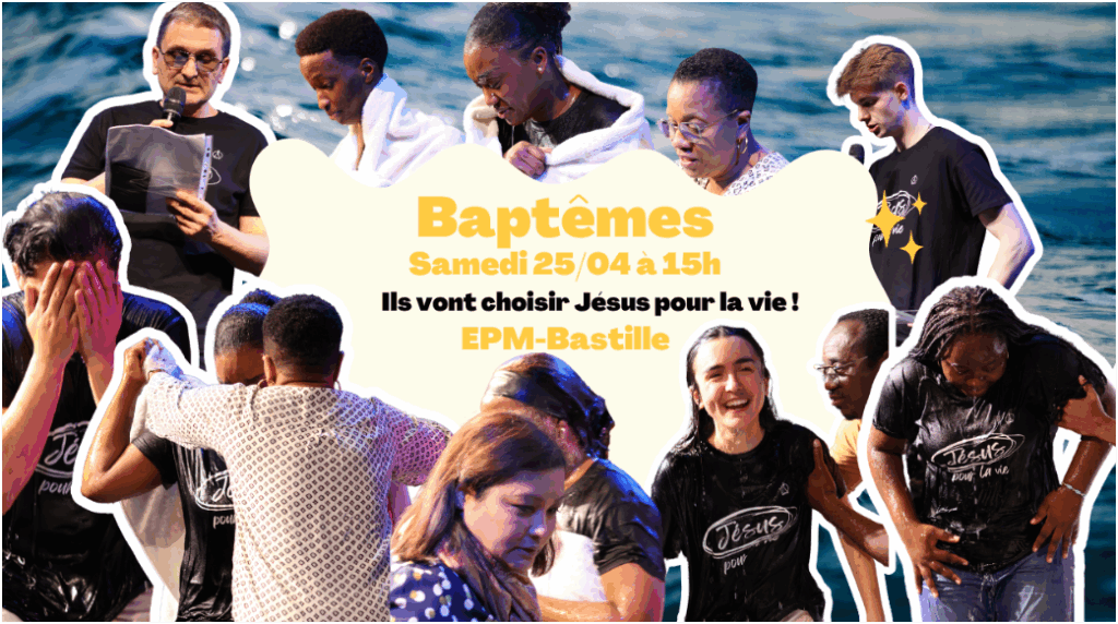 Bonne nouvelle, Carole, Richard, Emma, Fiona, Jasmine et Joëlle ont décidé de dire oui à Jesus. Nous vous invitons à la célébration de leur baptême le samedi 25 avril à 15h sur le campus de bastille. Gardons les dans la prière.