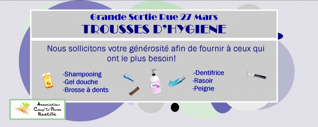 En vue de la grande sortie RUES prévue le vendredi 27 Mars dont l’objectif est de distribuer des trousses d’hygiène auprès des personnes isolées de la rue, nous sollicitons votre générosité.