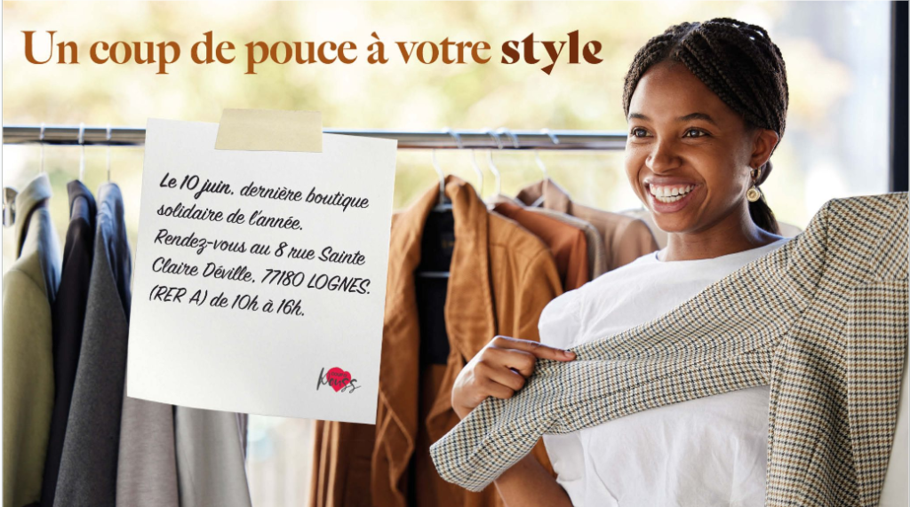 Dernière date d’ouverture de la boutique solidaire Coup D’Pouss pour l’année 2023 : samedi 10 juin 2023, de 10h à 16h à Lognes comme d’habitude. Une bonne occasion de faire un achat responsable et solidaire.