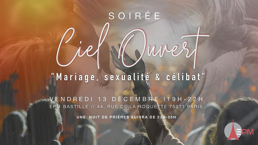 Le vendredi 13 décembre à 19h, nous aurons notre Soirée Ciel Ouvert sur le thème ‘Mariage, sexualité et célibat’. Elle sera suivie d’une Nuit de prières à partir de 23h jusqu’à l’aube.
