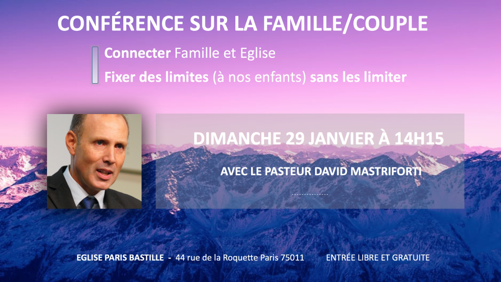 Nous vous donnons rdv le dimanche 29 janvier à l’Eglise Evangélique Paris Métropole – Bastille à 14h15 pour notre CONFERENCE SUR LE COUPLE/FAMILLE. Entrée libre et gratuite.