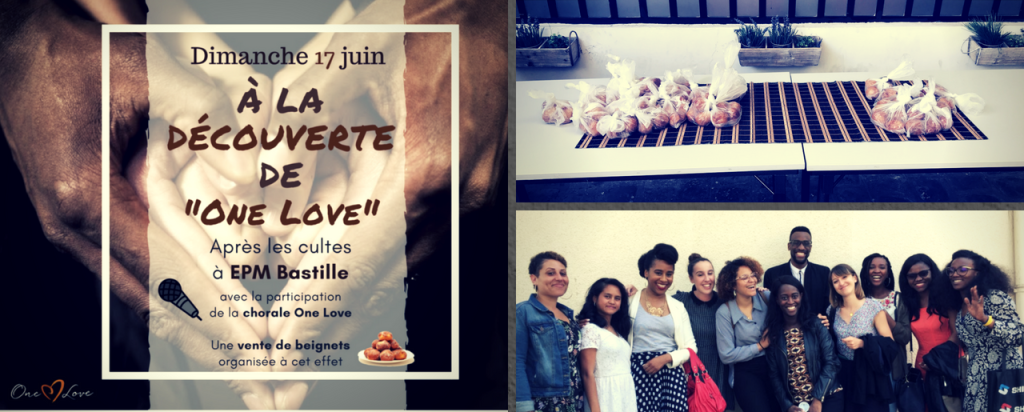 L’association organise une vente de beignets à cet effet qui contribuera à l’achat d’un minibus pour les enfants de la One Love House à Kinshasa. La chorale One Love participera à cet événement. Vous êtes attendus au Loft après les cultes du Campus Bastille le dimanche 17 juin.