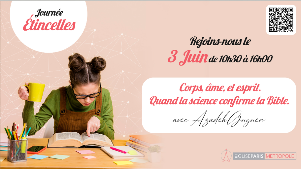 Le groupe de femmes du campus de Lognes, Etincelles, invite toutes les femmes du campus Samedi 3 juin 2023, 10h00-16h00 à une conférence avec Azadeh Guguen, médecin généraliste et chrétienne qui abordera le thème: Corps, âme et esprit; quand la science confirme la bible.