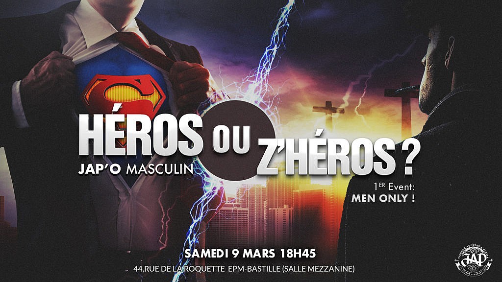 Dans la continuité de l’atelier spécial hommes du dernier week-end JAP, nous vous attendons, Messieurs, à notre 1er événement JAP’O masculin pour échanger autour de notre thème “Héros ou Z’Héros?”, le samedi 9 mars 2019 à 18h45 au campus EPM-Bastille !
