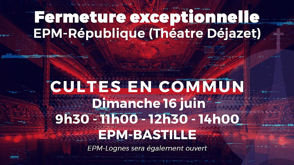 Ce dimanche 16 juin notre campus de République est exceptionnellement fermé. Par conséquent, nous aurons quatre cultes en commun sur le campus de Bastille : 09h30 – 11h00 – 12h30 – 13h00.