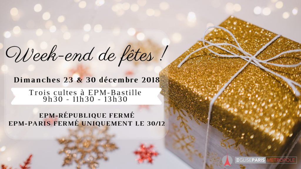 Les dimanches 23 et 30 décembre nous aurons trois cultes sur le campus EPM-Bastille à 09h30, 11h30 et à 13h30.