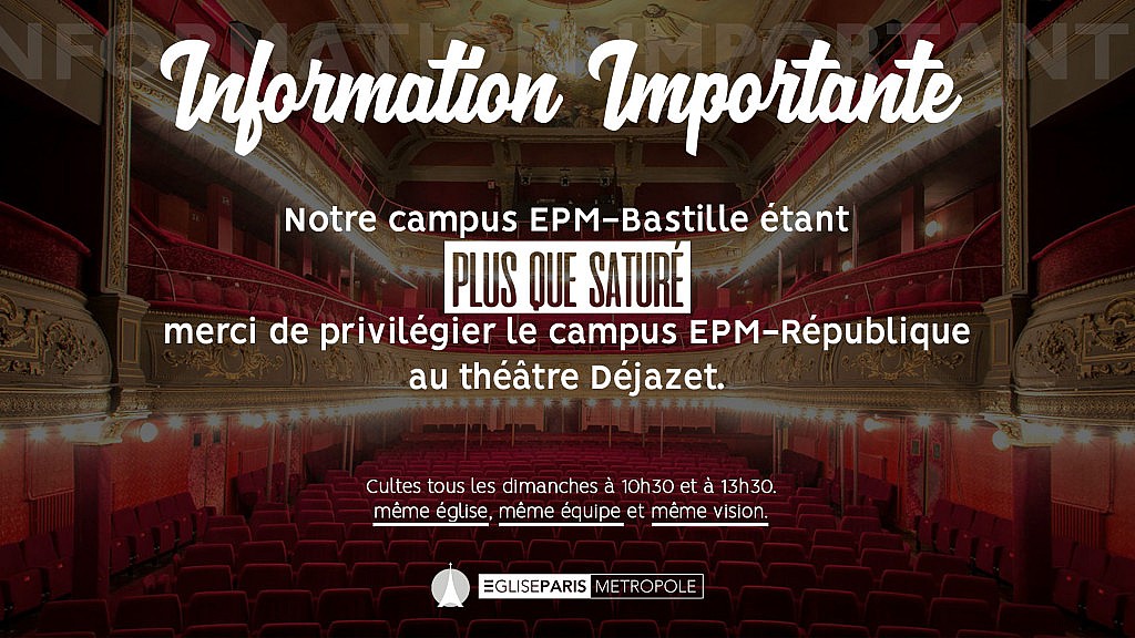 Notre campus EPM-Bastille étant plus que saturé tous les dimanches, merci de privilégier le campus EPM-République au théâtre Déjazet. Cultes tous les dimanches à 10h30 et à 13h30. Même église, même équipe et même vision.