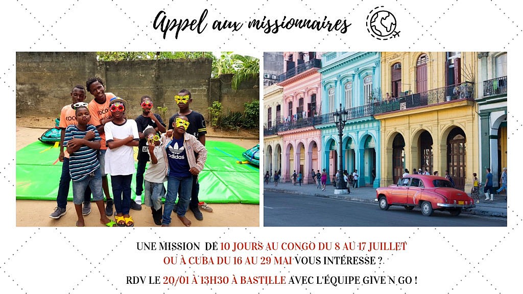 Une mission de 10 jours au Congo du 8 au 17 juillet 2019 et ou à Cuba du 16 au 29 mai 2019 vous intéresse ?