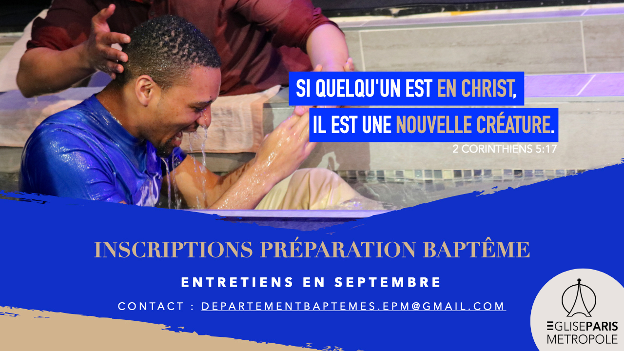 Pour tous ceux et celles qui souhaitent passer par les eaux du baptême, vous pouvez approcher les pasteurs à la fin des cultes pour vous inscrire pour la préparation.