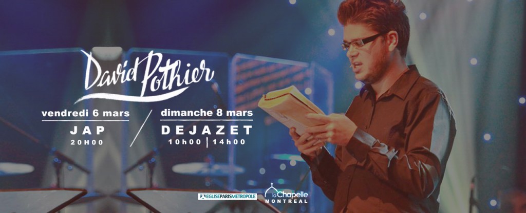 Dans le cadre de nos cultes en commun à Déjazet, nous recevons le pasteur David Pothier. Il a œuvré durant plusieurs années au sein du groupe de jeunesse de l’Eglise Nouvelle Vie au Québec, et exerce actuellement en tant que pasteur principal dans l’église La Chapelle à Montréal.