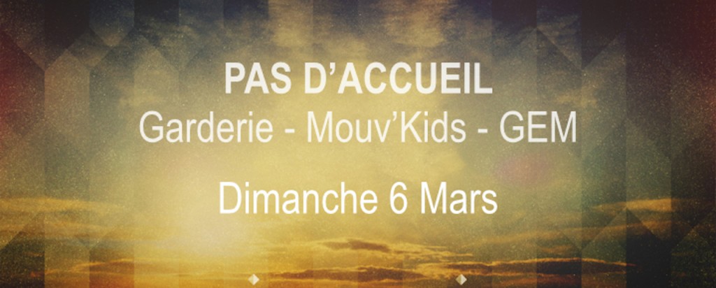 Lors des différents cultes du 6 mars, il n’y aura donc ni Garderie, ni Mouv’Kids, ni GEM. Merci de votre compréhension.