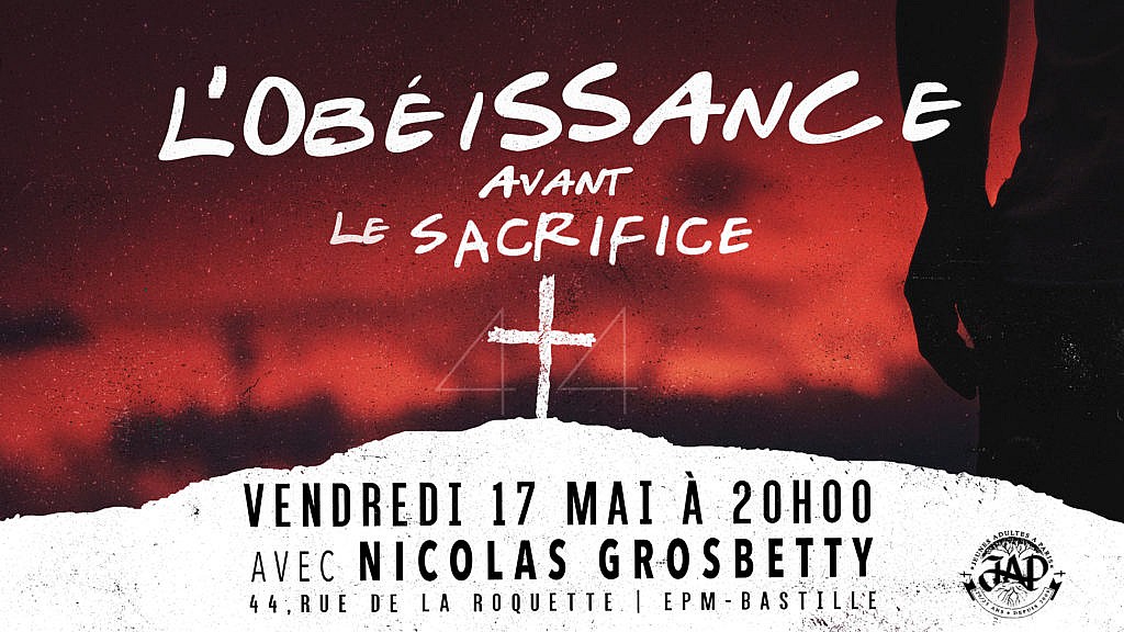 Jap te donne rdv à sa prochaine soirée Le 44 qui aura lieu le Vendredi 17 Mai. Le thème sera : “L’obéissance avant le sacrifice”. Notre orateur sera le pasteur Nicolas GROSBETTY qui nous vient de Suisse. Ce sera une réflexion sur l’obéissance comme une nécessité pour vivre une vie de disciple.