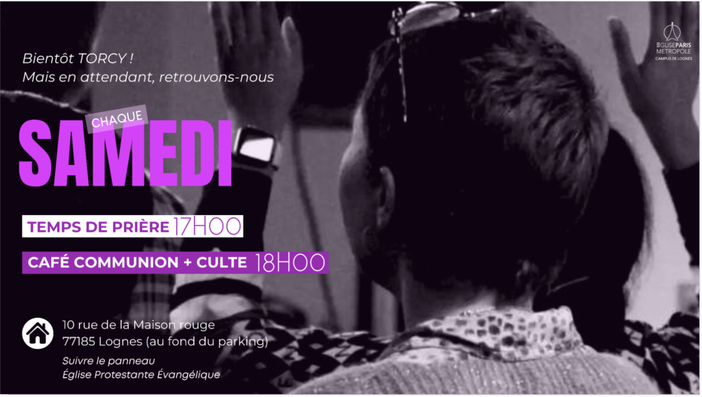 Comme vous le savez, nous ne serons plus dans ces locaux après le dimanche 20 octobre. Les nouveaux locaux n’étant pas encore prêts nous avons trouvé un lieu temporaire sur Lognes dans les locaux de l’Eglise évangélique des frères 10 rue de la maison rouge. Ne pouvant pas obtenir le créneau du dimanche nous nous réunirons le samedi à 18h30. rdv à 17:00 pour la prière et 18:00 pour le temps de communion.