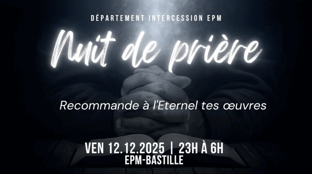 Nuit de prière le vendredi 12 décembre 2025, de 23H à 6h00 du matin : retrouvons nous pour un moment béni autour du thème “Recommande à l’Eternel tes œuvres”.