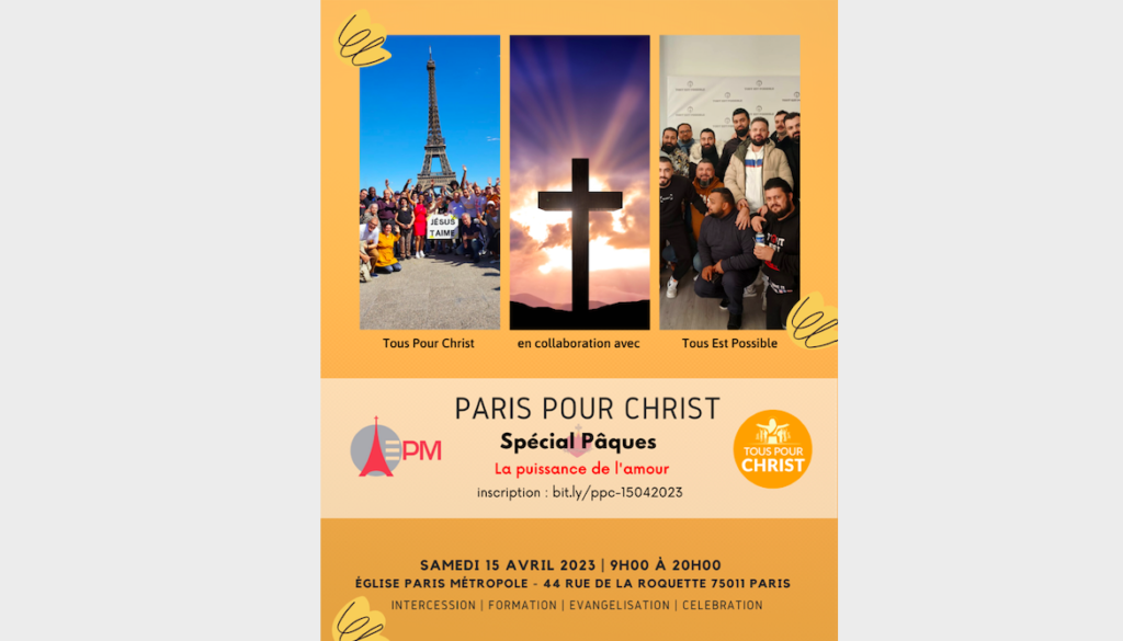 Paris Pour Christ revient à l’Église Paris métropole Bastille le Samedi 15 Avril sur le thème de “la Puissance de l’Amour” en collaboration avec Tout Est Possible.