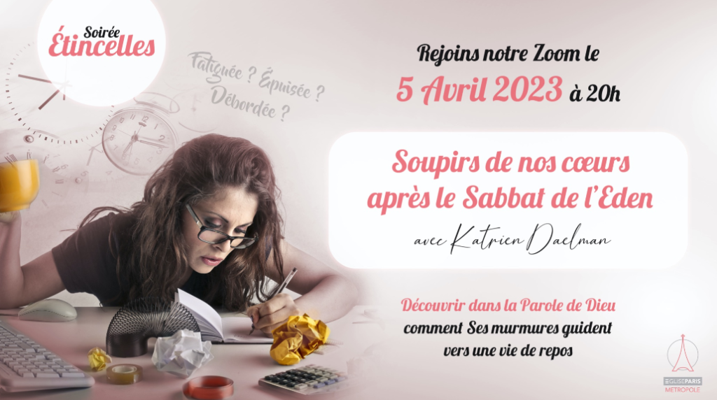 Rejoins notre Zoom le 5 Avril pour parler des « Soupirs de nos cœurs après le Sabbat de l’Eden » avec Katrien, pour découvrir dans la Parole de Dieu comment Ses murmures guident vers une vie de repos.