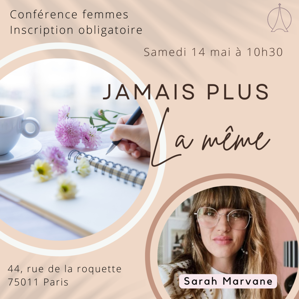 Le samedi 14 mai de 10h30 à 16h, les femmes sont invitées pour une rencontre autour du thème “Jamais plus la même” avec Sarah Marvane.