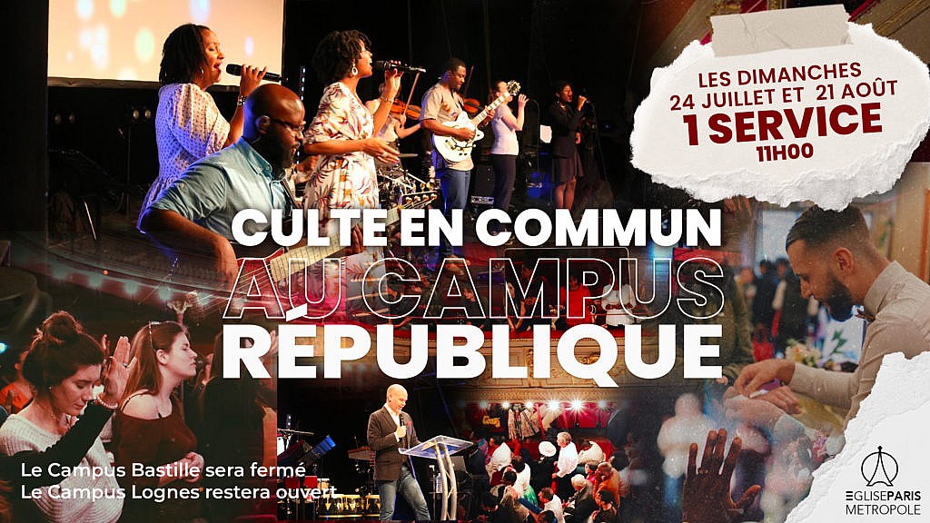 Les dimanches 24 Juillet et 21 Août prochain, il y aura un culte en commun (unique) à 11h00 au campus République. Bastille sera fermé mais Lognes restera ouvert.