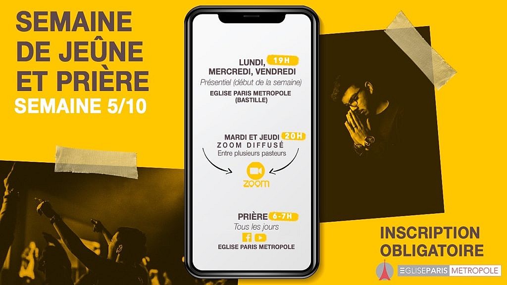 Pour notre semaine de Jeûne et de Prière le 5 octobre 2020, nous nous retrouverons les Lundi, Mercredi, Vendredi à partir de 19h sur EPM-Bastille et les Mardi et Jeudi à 20h en Live sur nos pages Facebook et Youtube.