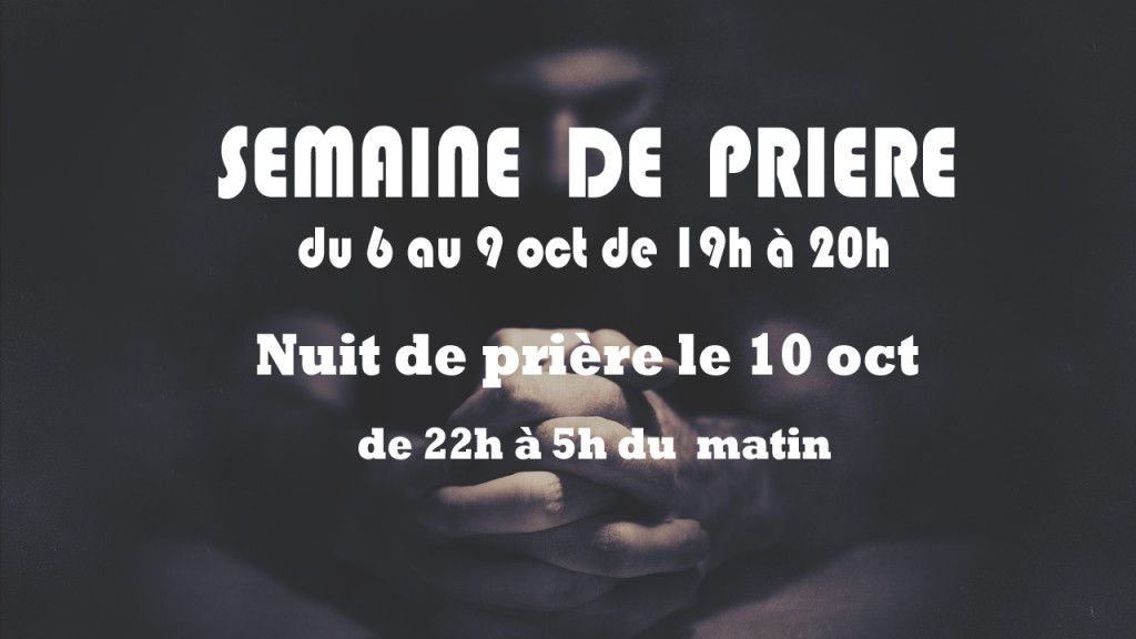 Prochaine semaine de prière et d’intercession de l’Eglise Paris Bastille le 6 au 9 octobre 2014 de 19h à 20h. La nuit de prière se fera le vendredi 10 octobre à partir de 22h avec plusieurs intervenants et avec la participations de Thierry NOEL à la louange.