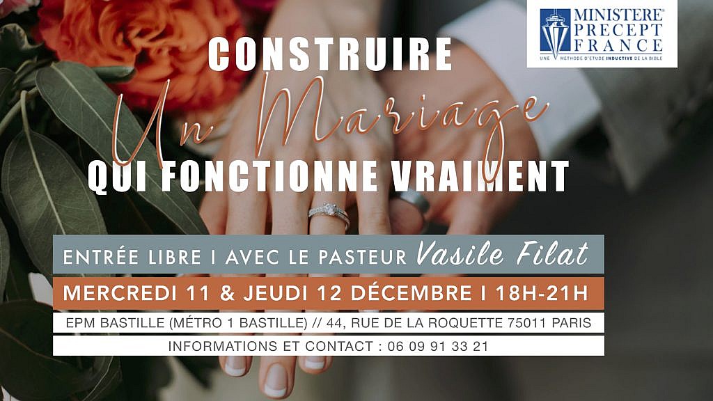 Le Ministère Precept France organise avec le Pasteur Vasile Filat un séminaire sur le mariage, mercredi 11 décembre et jeudi 12 décembre de 18h à 21h, à EPM-Bastille.