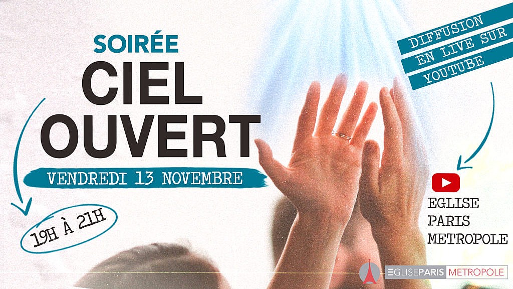 Nous aurons une soirée Ciel Ouvert en ligne, le 13 Novembre prochain à partir de 19h avec un temps de louange, de prédication et un temps de prières.