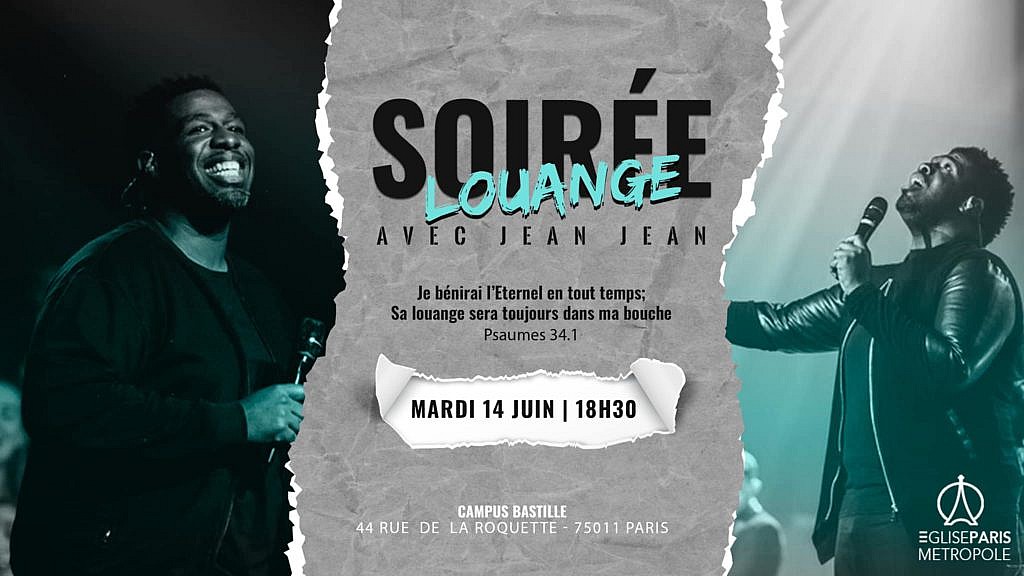 Nous recevons le mardi 14 juin l’artiste Jean Jean pour une soirée louange, soyez nombreux!