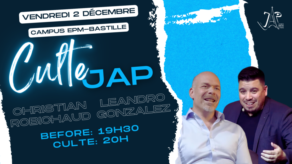 Culte JAP Vendredi 2 décembre. Ce sera un format particulier, en mode conversation informelle entre Pasteur Christian et Pasteur Leandro. Pasteur Christian a vraiment à coeur de vous bénir les JAPiens.
